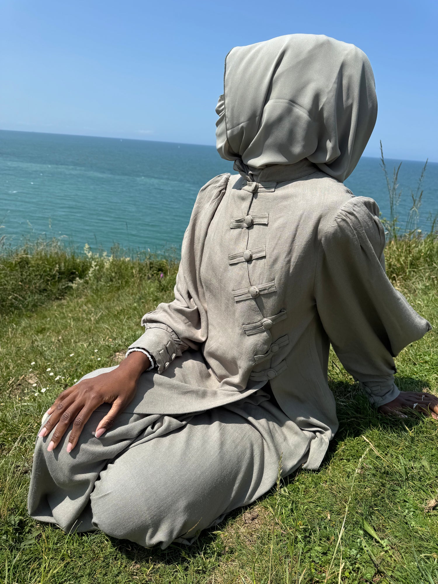Confectionné en lin, reconnu pour sa légèreté et sa respirabilité, ce set trois pièces allie style, modestie, confort et symbolique :
