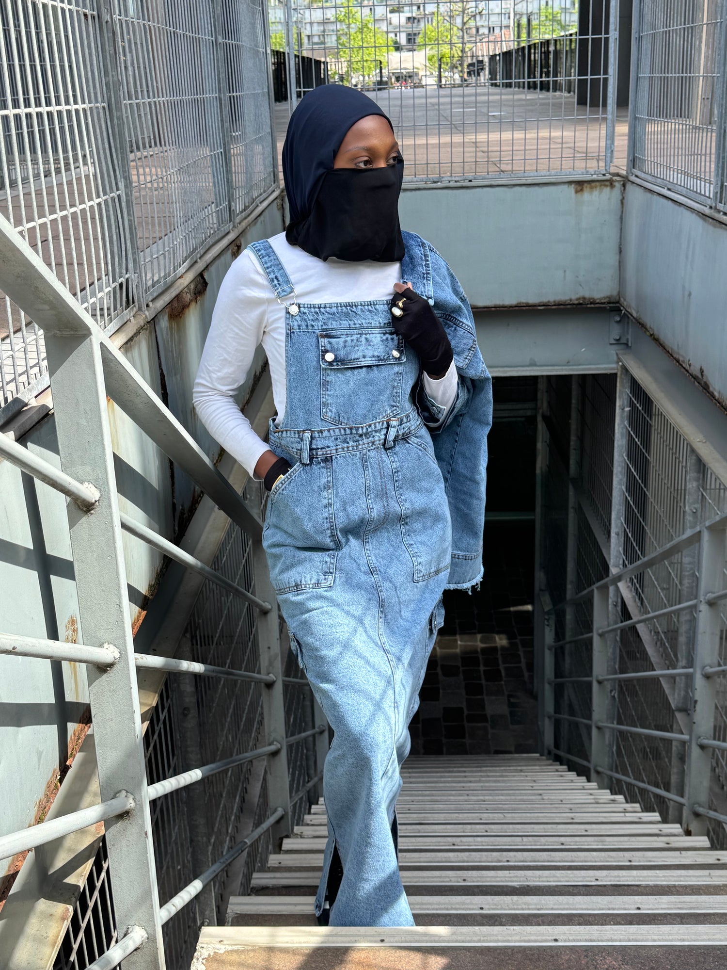 Pensée comme une déclaration de style, The Salopette se compose d’une salopette jupe cargo oversize en jean, accompagnée de sa veste assortie. Avec sa coupe ample et structurée, elle offre une liberté de mouvement à out en restant mastour.